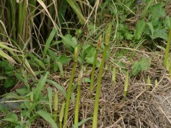 (土)ついに花茎がのびた「つぼみ」を発見した。翌日02/09/08 (日)の朝には、別の場所で咲いているのも発見。なにも特別にめずらしい風景ではないが、私にとっての「はしりもの」ということで報告をしておきます。(09/08