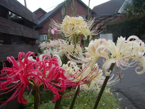 赤いヒガンバナを3年前に頂き,庭に地植えにしていました.昨秋赤い花とクリーム